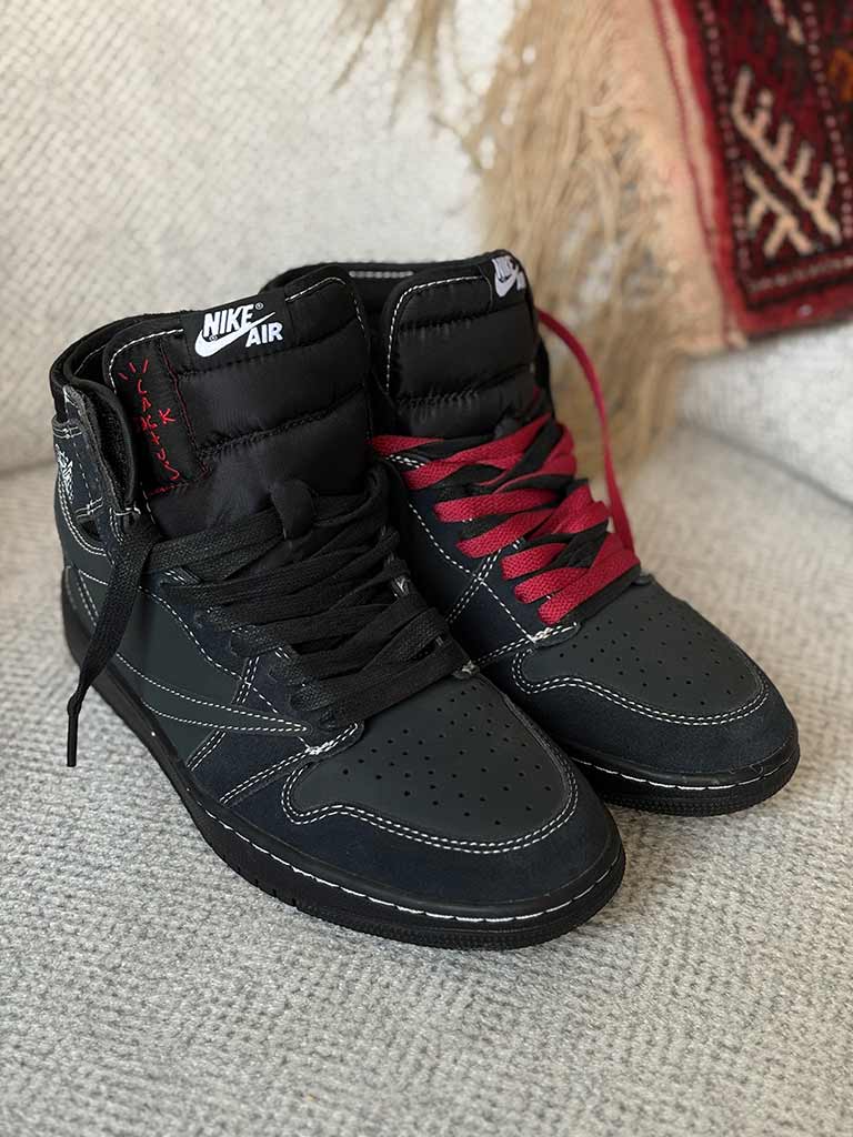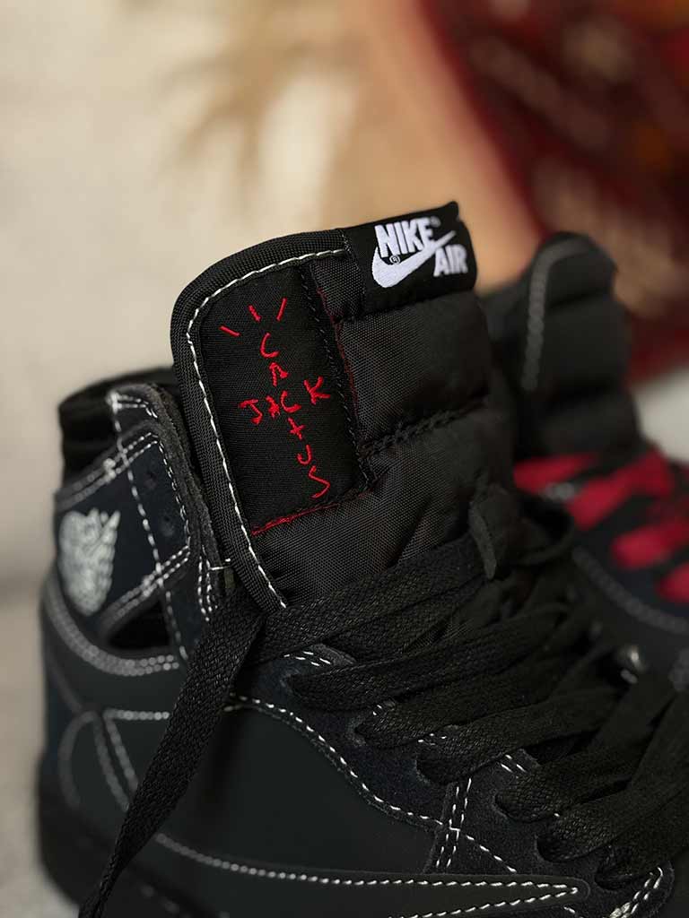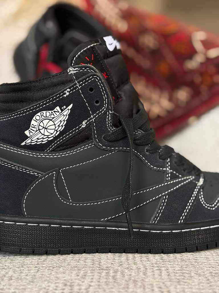 کتونی نایک جردن وان بلک فانتوم Nike Air Jordan 1 High Travis Scott Black Phantom یک همکاری بسیار محبوب بین نایک و تراویس اسکات است.این کفش دارای رویه مشکی با دوخت سفید و لوگوی Swoosh معکوس در سمت جانبی می باشد.نام تجاری تراویس اسکات نیز روی پاشنه و کفی وجود دارد. قسمت پایینی کتونی نایک جردن وان بلک فانتوم Nike Air Jordan 1 High Travis Scott Black Phantom دارای یک زیره لاستیکی مشکی با ساختار دیواری دوخته شده و یک بالشتک هوای محصور در ان نصب شده است. این قابلیت سبب می شود که پا عرق نکند و گردش هوا به طور یکنواخت در کفش انجام شود و بوی بدی ندهد. رویه این کفش با طرح دوختی که بر روی آن به تصویر کشانده شده بسیار زیبا و با دوام به نظر می رسد.